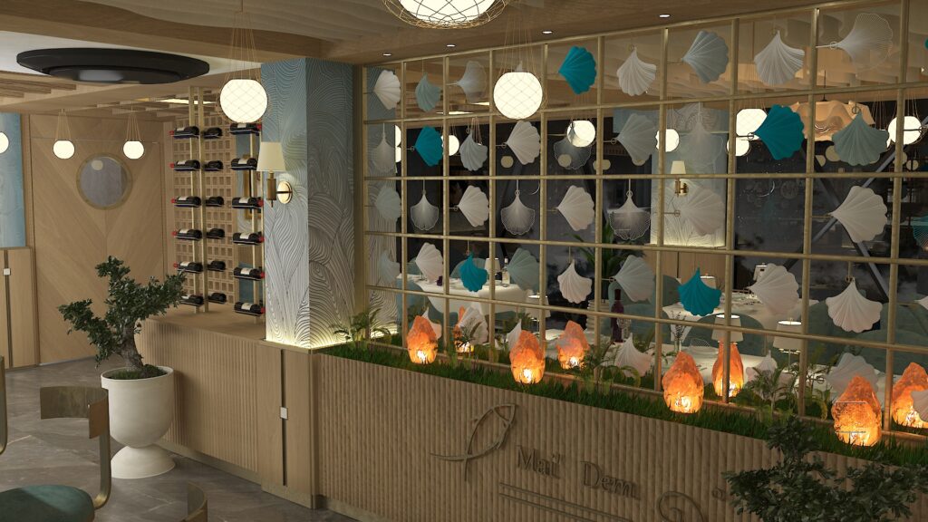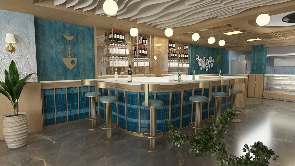 Bu balık restoranı projesinde, deniz esintisini mekâna taşımak amacıyla ahşap dokular ile mavi tonlarındaki seramikler bir araya getirildi. Doğal malzemelerin sıcaklığı, deniz temasını çağrıştıran serin renklerle dengelenerek ferah ve davetkâr bir atmosfer yaratıldı.