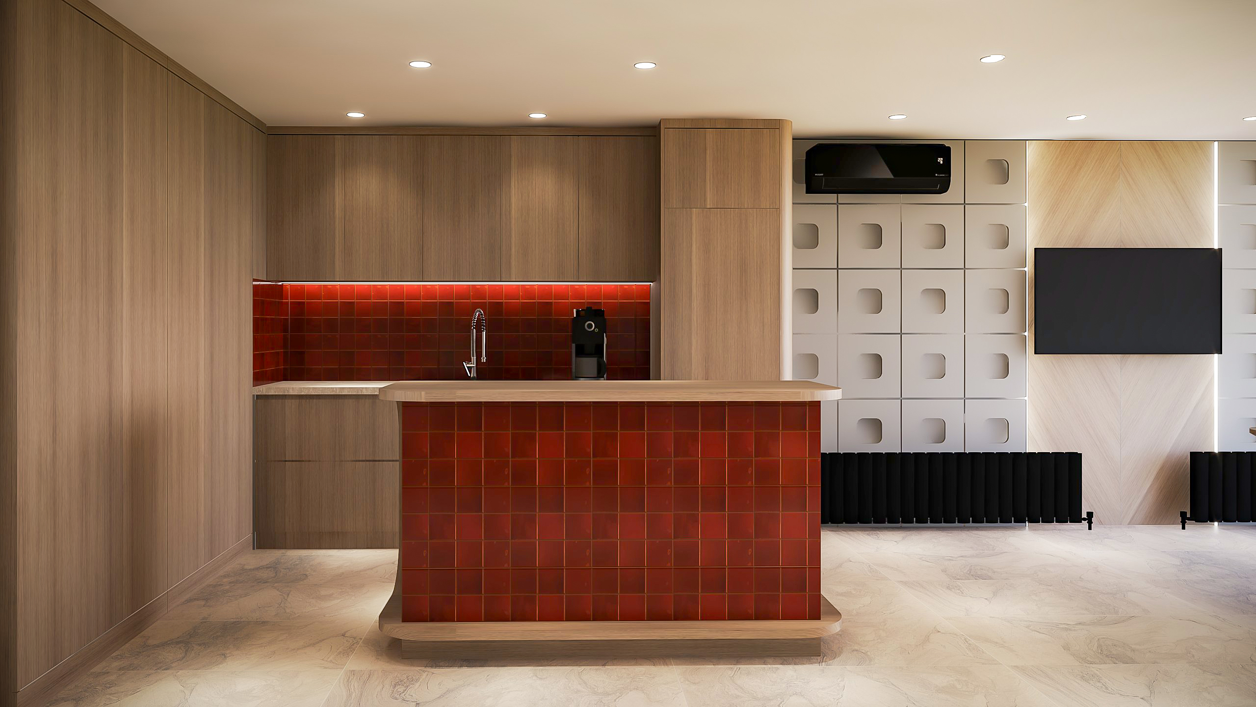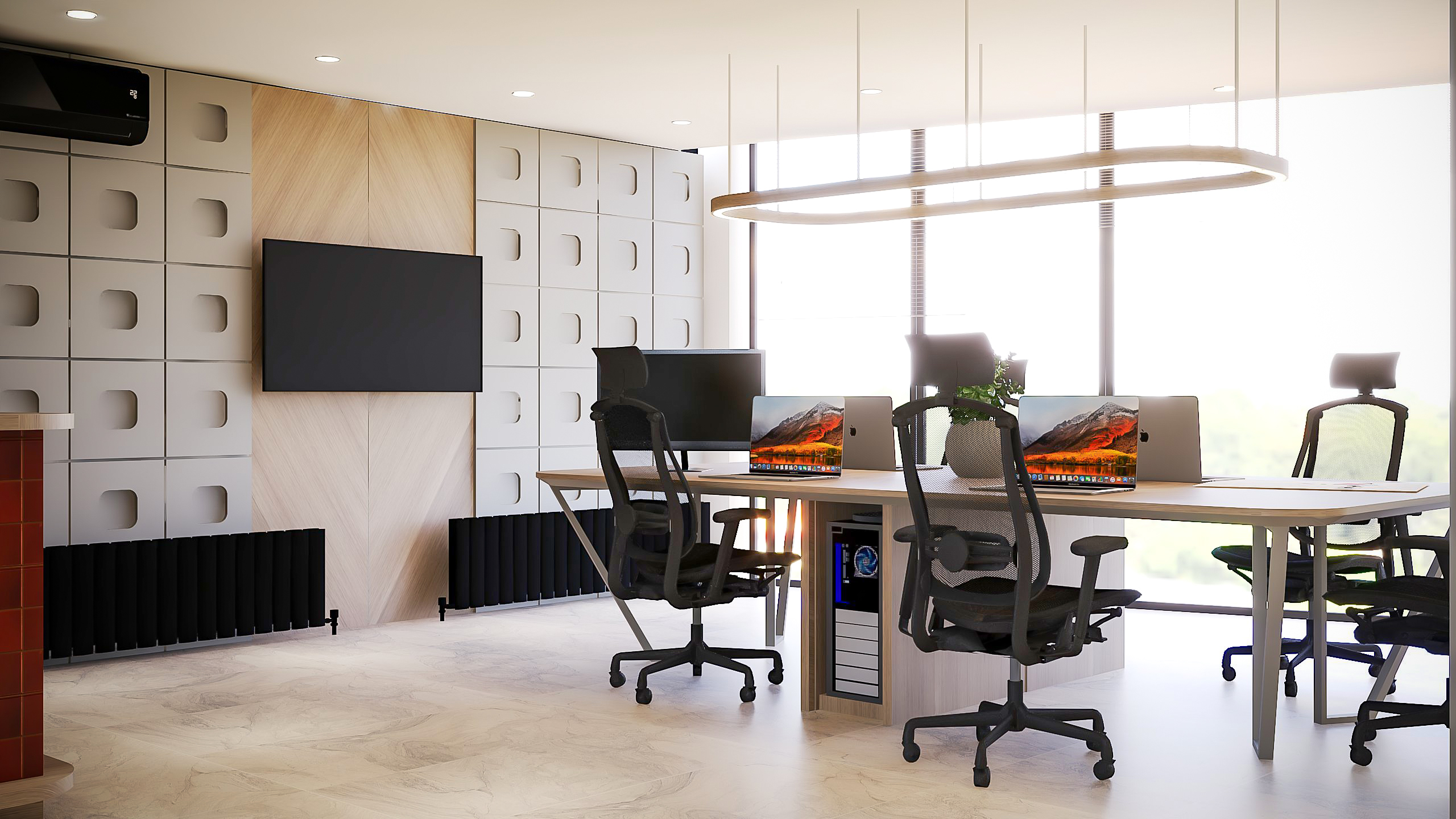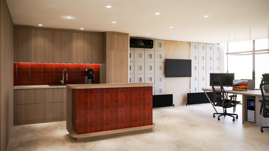 Nötr renk paletine eşlik eden turuncu seramik detaylar, tasarıma enerjik ve yaratıcı bir dokunuş kazandırdı. Doğal ışığın etkili kullanımı, açık ofis yapısı ve özenle seçilen malzemeler, hem estetik hem de işlevsel bir çalışma alanı oluşturdu.